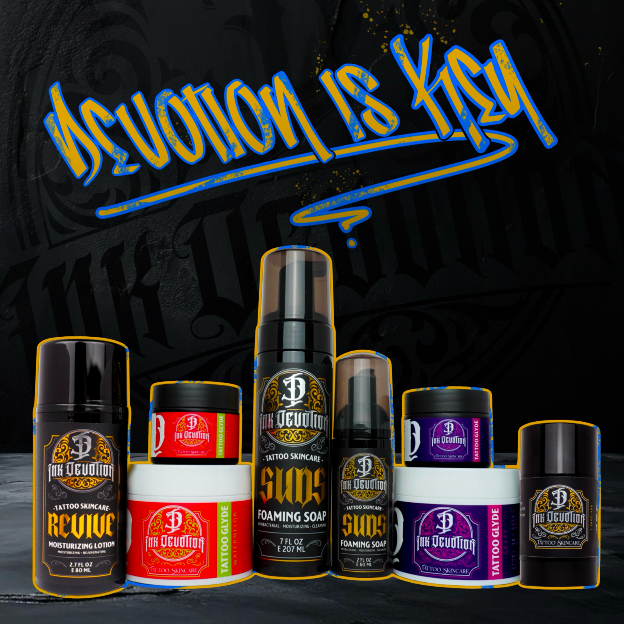 Ink Devotion Tatto Skincare offers Non-Petroleum based Tattoo products that were carefully and exclusively developed by a professional tattoo artist with nearly 2 decades of experience, in collaboration with Skincare professionals and cosmetic engineers, to support the tattoo healing process and maintain healthy, vibrant skin. Also great to use during the tattoo process.